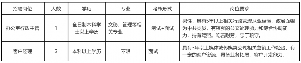 办公室行政主管考核方式为笔试、面试;客户经理考核方式为面试,时间和地点另行通知,请保持通讯设备畅通。