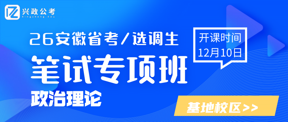 想在26安徽省考/选调生笔试的政治理论板块稳扎根基,摆脱“考点理不清、重点抓不准、双考备考没方向”的困扰?12月10日26安徽省考/选调生笔试专项班(政治理论)基地校区开课,就是你系统搭建政治理论知识框架、适配省考/选调生命题的优质选择!