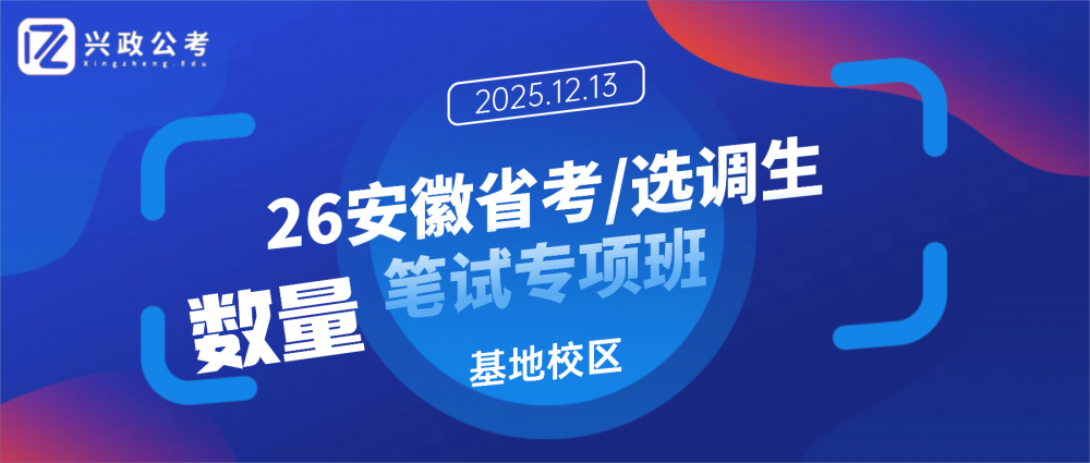 别再犹豫,把握26安徽省考/选调生笔试数量备考的黄金时期!12月13日,26安徽省考/选调生笔试专项班(数量)基地校区,赶快报名加入我们,在系统学习中夯实数量关系根基,为笔试高分筑牢基础。
